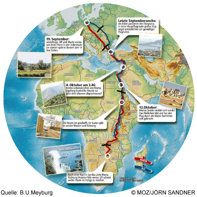 Hinter ihnen liegen eine 70tägige Reise und über 12.000 Flugkilometer. Nun haben Sie es geschafft: Die letzten Schreiadler Deutschlands, die im Sommer in Mecklenburg-Vorpommern und Brandenburg gebrütet haben, haben ihr Winterquartier im südlichen Afrika erreicht. Die Märkische Oderzeitung (MOZ) hat mit Unterstützung des Nabu seit Ende September zwei Schreiadler auf ihrem Zug in den Süden verfolgt. Allerdings sind weder Redakteure noch Funktionäre mitgeflogen, sondern die Adler trugen einen 20 Gramm leichten Sender huckepack. Das Adlerweibchen hat nun die Region um die Victoria-Fälle zwischen Sambia und Simbabwe erreicht während sich das Männchen vermutlich noch im Kongo aufhält.